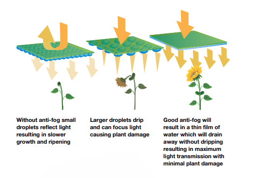 Using antifogging agents in agricultural films offers numerous benefits, including improved light transmittance, which enhances plant growth, increases yield per plant, and promotes earlier crop maturity. Additionally, antifogging agents reduce plant scorching and crop damage, as well as persistent dripping. Different climatic conditions and multilayer films need to be considered when selecting additives and determining dosage.